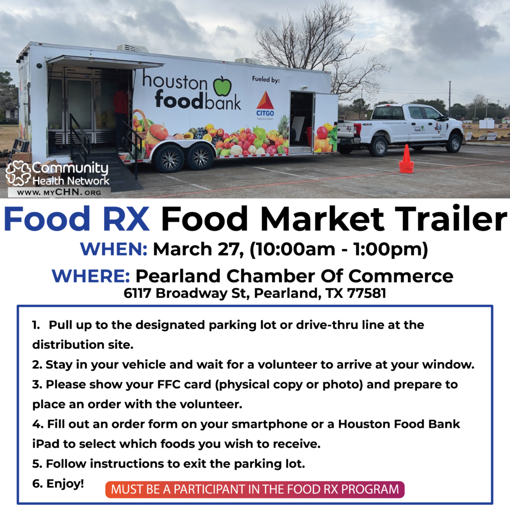 Pearland, TX, March 1st, 2023 – MyCHN is glad to announce that the Food RX Market Trailer will visit the Pearland Community on Monday, March 20th. The Food RX Market […]
